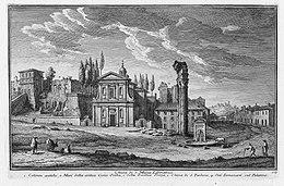 Prior to the present structures, the church of San Salvatore in Lacu, occupied by Benedictines, was located at this site, named because of its proximity to a site called the Lago di Gioturna. The church was assigned in 1550 by Pope Julius III to the Oblates of St Frances of Rome from the nearby Monastery of Tor de' Specchi.[6] The church of Santa Maria Liberatrice (Sancta Maria libera nos a poenis inferni) was built in 1617 on its ruins of Santa Maria Antiqua. This refurbishment was patronized by Cardinal Marcello Lante della Rovere and utilized the architect Onorio Longhi. The church was decorated by the painters Stefano Parrocel, Gramiccia (Lorenzo?), Francesco Ferrari, and Sebastiano Ceccarini.[7] The church of Maria Liberatrice, however, was demolished in 1900 to bring the remains of the old church to light.[8]