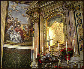 Inscriptions in the church record other connections with notable people. St Joseph Calasanctius, founder of the Piarists, after arriving in Rome in 1592 often prayed in the new church before the image of Our Lady. At the request of Pope Benedict XIII, the church and altar were rededicated in 1728 by the pope’s almoner,[2] Archbishop Nicola Saverio Albini, [3] titular bishop of Leuce. [4] St Paul of the Cross, founder of the Passionists, said Mass here in the years 1745 to 1767 when in Rome. St Alphonsus Liguori, founder of the Congregation of the Most Holy Redeemer, said Mass here from 25 April to 21 June 1762 as a guest of the Congregazione dei Pii Operai (Congregation of Pious Workers), who taught in the school for catechumens nearby at Via della Madonna dei Monti 39. St Vincent Pallotti, founder of the Union of Catholic Apostolate in 1835, was devoted to the Madonna dei Monti and to St Benedict Joseph Labre, buried in the church. Cardinal Vicenzo Pecci, later Pope Leo XIII, donated family money in 1856 to members of the Society of Saint Vincent de Paul who tended the sick poor at the church. Pope John Paul II paid a pastoral visit to the church on 8 March 1987.