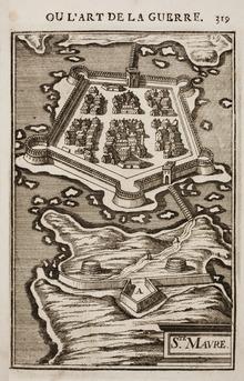The name Santa Maura is first attested for the island and its capital in 1292, when Genoese ships in Byzantine employ raided it.[12] In 1295, the Despot of Epirus Nikephoros I Komnenos Doukas ceded the island to his son-in-law, the Count palatine of Cephalonia and Zakynthos John I Orsini.[13] Orsini soon after received permission from Charles II of Naples to build a castle there,[14] which became the core of the Castle of Santa Maura.[13]