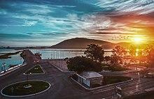Lefkada measures 35 kilometres (22 miles) from north to south, and 15 kilometres (9 miles) from east to west. The area of the island is about 302 square kilometres (117 sq mi), the area of the municipality (including the islands Kalamos, Kastos and several smaller islets) is 333.58 km2 (128.80 sq mi).[4] Its highest point is the mountain Stavrota, 1,158 metres (3,799 feet) above sea level,[5] situated in the middle of the island. The east coast section of the island has small resorts of Lygia, Nikiana and Perigiali, all north of Nidri, the largest resort on the island. It is set in a sheltered location with views across to Skorpios (formerly owned by Aristotle Onassis), Meganisi and other small islands, as well as the Greek mainland. The main coastal road from Lefkada to Vasiliki runs through the village, although a bypass has now been completed which skirts the village to the west. There are regular car ferries to Kefalonia, Ithaca and Meganissi.