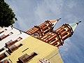 The Church and ex-convent of Santa Rosa de Viterbo is attributed to Alarife Ignacio Maraiano de las Casas and financed by José Velasquez de Lorea, finished in 1752. The church has twin entrances, which was common with convent churches. The two arches are decorated with mocking faces put there by Casas to those who did not think he could manage the building of the institution.[40] The outside is flanked by scroll-shaped flying buttresses, which only serve as decoration and are unique to Querétaro.[3][14] The tower has a unique shape and is topped with a pyramid-shaped crest. There is an inner doorway decorated in Churrigueresque style and an image of Saint Rose.[40] Inside, the most outstanding feature is the pulpit inlaid with ivory, nacre, turtle shell and silver,[3] and its altarpieces are gold covered in Querétaro Baroque style. The entrance to the sacristy contains paintings of José Velazquez de Lore and Sor Ana María de San Francisco y Neve. The convent complex was later amplified by Juan Caballero y Osio. The nuns began to dedicate themselves to primary education and by 1727 it became the Royal College of Santa Rosa. The convent was closed in 1861 due to the Reform Laws and was subsequently used as a hospital for about 100 years. Today the convent portion is home to the Centro de Estudios de Diseño y Artes Graficas Mexico-Italiano.[40]