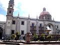 In the center of downtown is the Church of San Francisco, finished at the beginning of the 18th century and from then on the most important in town, serving as the cathedral until the 20th century.[3] It and the attached cloister is all that is left of a large complex that included several chapels and an orchard that extended for blocks to the east and south.[14] On the facade, there is a depicting of Saint James fighting the Moors, cutting the head off of one.[12] The main altar is Neoclassic, and replaced what reputedly was a masterpiece of Baroque design. This has happened frequently in the city; those Baroque altars not plundered over the course of Mexican history were replaced by newer designs.[14] Older Baroque side altarpieces are still here, and are covered in gold leaf. Other notable pieces here include a large Baroque music stand and the seating of the choir section both done by architect Francisco Eduardo Tresguerras of Celaya in the 18th century. There are also sculptures done by Mariano Montenegro and Mariano Arce.[3]