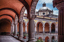 The church and monastery of La Santa Cruz is on Sangremal Hill, where the appearance of Saint James is said to have occurred at the founding of the city and the cross commemorating the event is kept.[3][6] Both the church and the monastery are Franciscan, and in one of the few monasteries to be in operation in Mexico.[14] This was also the site of the Colegio de la Propagación de la Fe, the first missionary school established in the Americas. From here, missionaries such as Junípero Serra set out on foot, as required by the Order, to establish missions as far away as Texas and California.[12] During the early War of Independence, Miguel Domínguez, Querétaro's mayor and part of the 1810 Conspiracy was imprisoned here. The church has been completely restored and its main attraction is the pink stone cross that was placed on this hill in the 16th century. Its altarpieces are also of pink stone and are a mix of Baroque and Neoclassical.[3] Tours are available here and feature how the aqueduct brought water here to cisterns, from which the residents of the city would fill their buckets. There is also a thorn tree said to have grown from the walking stick of Friar Antonio Margil de Jesús, and is considered miraculous as the thorns grow in the shape of a cross.[14]