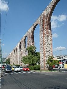 The most prominent feature of the city is the enormous aqueduct of Querétaro, consisting of seventy-four arches, each twenty meters wide with a total extension of 1,280 meters and an average height of 23 meters.[3] It was built by the Marquis Juan Antonio de Urrutia y Arana between 1726 and 1738 at the request of the nuns of the Santa Clara Convent to bring water to the residents of the city from La Cañada.[24]