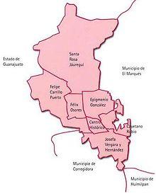 - Josefa Vergara y Hernández: on the slopes of the Cerro del Cimatario, its easternmost area is known as Centro Sur, where the Stadium, Bus Station and City Hall are located. (pop. 200,000; area 33 km2)