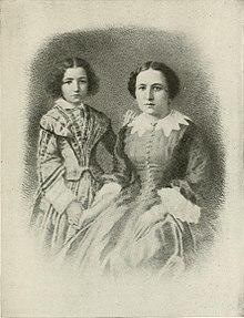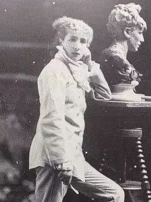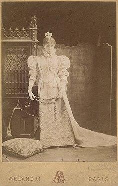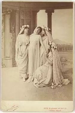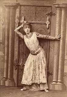 When Bernhardt was seven, her mother sent her to a boarding school for young ladies in the Paris suburb of Auteuil, paid with funds from her father's family. There, she acted in her first theatrical performance in the play Clothilde, where she held the role of the Queen of the Fairies, and performed her first of many dramatic death scenes.[8] While she was in the boarding school, her mother rose to the top ranks of Parisian courtesans, consorting with politicians, bankers, generals, and writers. Her patrons and friends included Charles de Morny, Duke of Morny, the half-brother of Emperor Napoleon III and President of the French legislature.[9] At the age of 10, with the sponsorship of Morny, Bernhardt was admitted to Grandchamp, an exclusive Augustine convent school near Versailles.[10] At the convent, she performed the part of the Archangel Raphael in the story of Tobias and the Angel.[11] She declared her intention to become a nun, but did not always follow convent rules; she was accused of sacrilege when she arranged a Christian burial, with a procession and ceremony, for her pet lizard.[12] She received her first communion as a Roman Catholic in 1856, and thereafter she was fervently religious. However, she never forgot her Jewish heritage. When asked years later by a reporter if she were a Christian, she replied: "No, I'm a Roman Catholic, and a member of the great Jewish race. I'm waiting until Christians become better."[13] That contrasted her answer, "No, never. I'm an atheist" to an earlier question by composer and compatriot Charles Gounod if she ever prayed.[14] Regardless, she accepted the last rites shortly before her death.[15]