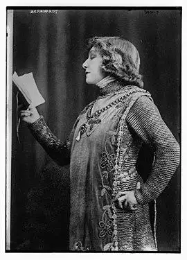Sarah Bernhardt (French: [saʁa bɛʁnɑʁt];[note 1] born Henriette-Rosine Bernard; 22 or 23 October 1844 – 26 March 1923) was a French stage actress who starred in some of the most popular French plays of the late 19th and early 20th centuries, including La Dame Aux Camelias by Alexandre Dumas, fils; Ruy Blas by Victor Hugo, Fédora and La Tosca by Victorien Sardou, and L'Aiglon by Edmond Rostand. She also played male roles, including Shakespeare's Hamlet. Rostand called her "the queen of the pose and the princess of the gesture", while Hugo praised her "golden voice". She made several theatrical tours around the world, and was one of the first prominent actresses to make sound recordings and to act in motion pictures.