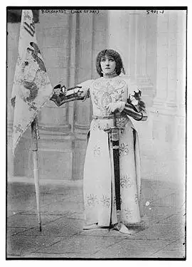 Following this success, she acted in several revivals and classics, and many French writers offered her new plays. In 1887, she acted in a stage version of the controversial drama Thérèse Raquin by Emile Zola. Zola had previously been attacked due to the book's confronting content. Asked why she chose this play, she declared to reporters, "My true country is the free air, and my vocation is art without constraints."[99] The play was unsuccessful; it ran for just 38 performances.[103] She then performed another traditional melodrama, Francillon by Alexandre Dumas, fils in 1888. A short drama she wrote herself, L'Aveu, disappointed both critics and the audience and lasted only 12 performances. She had considerably more success with Jeanne d'Arc by the poet Jules Barbier, in which the 45-year-old actress played Joan of Arc, a 19-year-old martyr.[104] Barbier had previously written the librettos for some of the most famous French operas of the period, including Faust by Charles Gounod and The Tales of Hoffmann by Jacques Offenbach. Her next success was another melodrama by Sardou and Moreau, Cleopatra, which allowed her to wear elaborate costumes and finished with a memorable death scene. For this scene, she kept two live garter snakes, which played the role of the poisonous asp which bites Cleopatra. For realism, she painted the palms of her hands red, though they could hardly be seen from the audience. "I shall see them," she explained. "If I catch sight of my hand, it will be the hand of Cleopatra."[105]