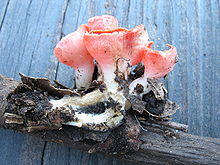 A saprobic species,[38] Sarcoscypha coccinea grows on decaying woody material from various plants: the rose family, beech, hazel, willow, elm, and, in the Mediterranean, oak.[39] The fruit bodies of S. coccinea are often found growing singly or clustered in groups on buried or partly buried sticks in deciduous forests.[16] A Hungarian study noted that the fungus was found mainly on twigs of European hornbeam (Carpinus betulus) that were typically less than 5 cm (2.0 in) long.[40] Fruit bodies growing on sticks above the ground tend to be smaller than those on buried wood. Mushrooms that are sheltered from wind also grow larger than their more exposed counterparts.[41] The fruit bodies are persistent and may last for several weeks if the weather is cool.[42] The time required for the development of fruit bodies has been estimated to be about 24 weeks, although it was noted that "the maximum life span may well be more than 24 weeks because the decline of the colonies seemed to be associated more with sunny, windy weather rather than with old age."[41] One field guide calls the fungus "a welcome sight after a long, desperate winter and ... the harbinger of a new year of mushrooming."[43]