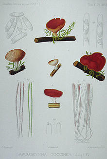 Sarcoscypha coccinea is the type species of the genus Sarcoscypha, having been first explicitly designated as such in 1931 by Frederick Clements and Cornelius Lott Shear.[14] A 1990 publication revealed that the genus name Sarcoscypha had been used previously by Carl F. P. von Martius as the name of a tribe in the genus Peziza;[15] according to the rules of Botanical Nomenclature, this meant that the generic name Peziza had priority over Sarcoscypha. To address the taxonomical dilemma, the genus name Sarcoscypha was conserved against Peziza, with S. coccinea as the type species, to "avoid the creation of a new generic name for the scarlet cups and also to avoid the disadvantageous loss of a generic name widely used in the popular and scientific literature".[10] The specific epithet coccinea is derived from the Latin word meaning "deep red". The species is commonly known as the "scarlet elf cup",[16] the "scarlet elf cap",[17] or the "scarlet cup fungus".[18]