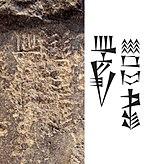 Sargon of Akkad on his victory stele, with inscription "King Sargon" ( Šar-ru-gi lugal) vertically inscribed in front of him. | |