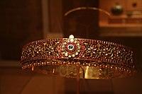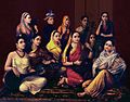 Different courts adopted their own styles of draping and indigenising the sari. In most of the courts the sari was embellished with stitching hand-woven borders in gold from Varanasi, delicate zardozi work, gota, makaish and tilla work that embellished the plain fabric, simultaneously satisfying both traditional demands and ingrained love for ornamentation. Some images of maharanis in the Deccan show the women wearing a sleeveless, richly embellished waistcoat over their blouses. The Begum of Savanur remembers how sumptuous the chiffon sari became at their gatherings. At some courts, it was worn with jaali, or net kurtas and embossed silk waist length sadris or jackets. Some of them were so rich that the entire ground was embroidered over with pearls and zardozi.[73][74]