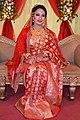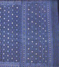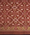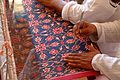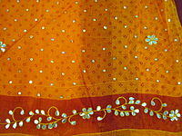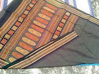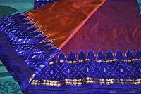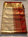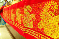 Red is most favoured colour for wedding saris and are traditional garment choice for brides in Indian culture.[52] Women traditionally wore various types of regional handloom saris made of silk, cotton, ikkat, block-print, embroidery and tie-dye textiles. Most sought after brocade silk saris are Banasari, Kanchipuram, Gadwal, Paithani, Mysore, Uppada, Bagalpuri, Balchuri, Maheshwari, Chanderi, Mekhela, Ghicha, Narayan pet and Eri etc. are traditionally worn for festive and formal occasions.[53] Silk Ikat and cotton saris known as Patola, Pochampally, Bomkai, Khandua, Sambalpuri, Gadwal, Berhampuri, Bargarh, Jamdani, Tant, Mangalagiri, Guntur, Narayan pet, Chanderi, Maheshwari, Nuapatn, Tussar, Ilkal, Kotpad and Manipuri were worn for both festive and everyday attire.[54] Tie-dyed and block-print saris known as Bandhani, Leheria/Leheriya, Bagru, Ajrakh, Sungudi, Kota Dabu/Dabu print, Bagh and Kalamkari were traditionally worn during monsoon season.[55] Gota Patti is popular form of traditional embroidery used on saris for formal occasions, various other types of traditional folk embroidery such mochi, pakko, kharak, suf, kathi, phulkari and gamthi are also commonly used for both informal and formal occasion.[56][57] Today, modern fabrics like polyester, georgette and charmeuse are also commonly used.[58][59][60]
