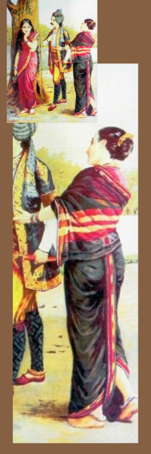 Poetic references from works like Silappadikaram indicate that during the Sangam period in ancient Tamil Nadu in southern India, a single piece of clothing served as both lower garment and head covering, leaving the midriff completely uncovered.[32] Similar styles of the sari are recorded paintings by Raja Ravi Varma in Kerala.[41] Numerous sources say that everyday costume in ancient India until recent times in Kerala consisted of a pleated dhoti or (sarong) wrap, combined with a breast band called kūrpāsaka or stanapaṭṭa and occasionally a wrap called uttarīya that could at times be used to cover the upper body or head.[15] The two-piece Kerala mundum neryathum (mundu, a dhoti or sarong, neryath, a shawl, in Malayalam) is a survival of ancient clothing styles. The one-piece sari in Kerala is derived from neighbouring Tamil Nadu or Deccan during medieval period based on its appearance on various temple murals in medieval Kerala.[42][5][6][43]