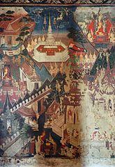 According to the Pali Canon, in the distant past Śāriputra was born a wealthy brahmin named Sarada who gave away his wealth to become an ascetic who developed a large following. At that time, Sarada and his followers were visited by the past Buddha, Anomadassī, and were given a sermon by Anomadassī Buddha and his chief disciples. Upon hearing the sermon from Anomadassī Buddha's first chief disciple, Nisabha, Sarada became inspired and resolved to become the first chief disciple of a future Buddha. He then made this wish in front of Anomadassī Buddha, who looked into the future and then declared that his aspiration would come true. Upon hearing the prediction, Sarada went to his close friend Sirivaddhana and asked him to resolve to become the second chief disciple of the same Buddha. Sirivaddhana then made a large offering to Anomadassī Buddha and his following and made the wish as suggested. Anomadassī Buddha looked into the future and declared that Sirivaddhana's aspiration would also come true.[6] The two friends then spent the rest of their lives and many future lives doing good deeds.[7] According to Buddhist legend, the aspiration came true in the time of Gautama Buddha with Sarada being reborn as Śāriputra and Sirivaddhana being reborn as Maudgalyāyana.[6][7]