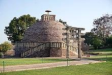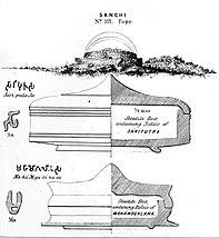 In 1851, archaeologists Alexander Cunningham and Lieutenant Fred. C. Maisey discovered a pair of sandstone boxes with encased bone fragments inside during an excavation of one of the stupas in the city of Sanchi, with Śāriputra's and Maudgalyāyana's names inscribed on them in Brāhmī text.[106][107] Śāriputra's casket contained pieces of sandalwood, which Cunningham believed was part of Śāriputra's funeral pyre.[108] Śāriputra's box was positioned at the south, while Maudgalyāyana's was positioned at the north.[109] According to Cunningham, people in ancient India sat facing the east during religious ceremonies and even used the word east (para) for "front", as well as the word south (dakshina) for "right" and the word north (vami) for "left", meaning the positioning of the caskets symbolized each disciple's relative positions as right and left hand disciple respectively.[46] This positioning has also been explained by the fact that the Buddha traditionally sat facing the east, which would make the south his right hand side, and the north his left hand side.[110] Another excavation by Cunningham and Maisey at stupas in the nearby town of Satdhāra found another pair of caskets with encased bone fragments with the two chief disciples' names inscribed.[106] Cunningham concluded that the relics were enshrined in stupas near Rajagaha after the disciples' deaths until the time of King Asoka, who then redistributed them in stupas throughout India.[111] Scholars have also theorized that a Sunga king may have also have done a similar redistribution of the relics of the Buddha and his leading disciples and built stupas such as the one in Sanchi to enshrine them.[112]