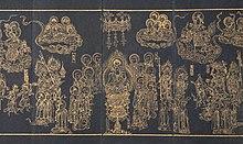 In Buddhist art, he is often depicted alongside the Buddha and Maudgalyāyana, with Śāriputra usually depicted on the Buddha's right hand side and Maudgalyāyana usually depicted on the Buddha's left hand side.[9] According to Nyanaponika Thera, this imagery symbolizes the relative positions they held in life, with Śāriputra being the Buddha's right hand monk.[45] In Mahayana Buddhism this iconography of flanking the Buddha on his right and left is sometimes used for other figures as well, such as the Mahayana bodhisattvas Samantabhadra and Mañjuśrī, or the disciples Ānanda and Mahākāśyapa.[125] In Burma, Śāriputra is believed to grant wisdom to worshippers, and is one of eight arhats commonly shown devotion to in protective rituals.[126]