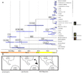 Sarracenia and Darlingtonia are native to North America, while Heliamphora is native to South America. Phylogenetic analysis suggests that the family originated in South America about 47 million years ago and spread to North America soon after, about 35 million years ago.[5] The Sarracenia and Heliamphora clade diverged from Darlingtonia around this time, most likely due to a cooling event at the beginning of the Oligocene.[5] Sarracenia diverged from Heliamphora later, around 23 million years ago.[5]