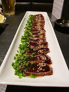 - ^ With cases reported in 2012, Ministry of Health, Labour and Welfare banned beef liver to be served as sashimi after 12 cases of food poisoning was reported.[23][24] The regulation was tightened in 2015 and pork liver was added to banned offal.[25]