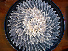 To highlight the delicate flavor as well as for texture, the chef cuts fish into different thicknesses by variety of the fish, its age and by the season.[6][7][8] The hira-zukuri cut (literally "flat slice"), is the standard cut for most sashimi. Typically this style of cut is the size of a domino and 10 mm (3&fras1;8 in) thick. Tuna, salmon, and kingfish are most commonly cut in this style. The usu-zukuri cut (literally "thin slice"), is an extremely thin, diagonally cut slice that is mostly used to cut firm fish, such as bream, whiting, and flounder. The dimensions of this fish is usually 50 mm (2 in) long and 2 mm (1&fras1;16 in) wide. The kaku-zukuri cut (literally "square slice"), is the style in which sashimi is cut into small cubes that are 20 mm (3&fras1;4 in) on each side. The ito-zukuri cut (literally "thread slice"), is the style in which the fish is cut into fine strips, less than 2 mm (1&fras1;16 in) in diameter. The fish typically cut with the ito-zukuri style include garfish and squid;[9][10] squid dish prepared in ito-zukuri is also called ika sōmen and you dip them in dashi or men-tsuyu like eating sōmen noodle.[6]