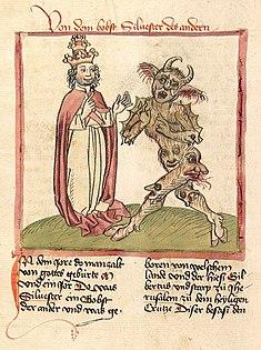 Medieval miniature depicting Pope Sylvester II consorting with Satan (c. 1460)