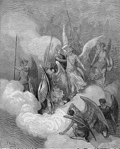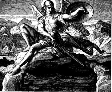 St. Michael Vanquishing Satan (1518) by Raphael, depicting Satan being cast out of heaven by Michael the Archangel, as described in Revelation 12:7–8