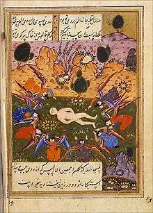 Angels bow before the newly created Adam, but Iblis (top right on the picture) refuses to prostrate