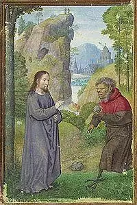 Sixteenth-century illustration by Simon Bening showing Satan approaching Jesus with a stone