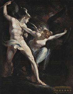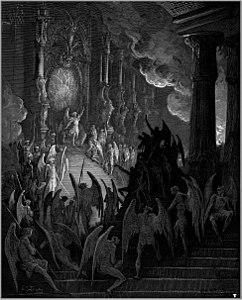 The most common English synonym for "Satan" is "devil", which descends from Middle English devel, from Old English dēofol, that in turn represents an early Germanic borrowing of Latin diabolus (also the source of "diabolical"). This in turn was borrowed from Greek diabolos "slanderer", from diaballein "to slander": dia- "across, through" + ballein "to hurl".[64] In the New Testament, the words Satan and diabolos are used interchangeably as synonyms.[65][66] Beelzebub, meaning "Lord of Flies", is the contemptuous name given in the Hebrew Bible and New Testament to a Philistine god whose original name has been reconstructed as most probably "Ba'al Zabul", meaning "Baal the Prince".[67] The Synoptic Gospels identify Satan and Beelzebub as the same.[65] The name Abaddon (meaning "place of destruction") is used six times in the Old Testament, mainly as a name for one the regions of Sheol.[68] Revelation 9:11 describes Abaddon, whose name is translated into Greek as Apollyon, meaning "the destroyer", as an angel who rules the Abyss.[69] In modern usage, Abaddon is sometimes equated with Satan.[68]