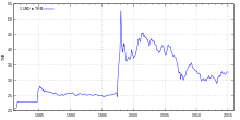 From 1956 until 1973, the baht was pegged to the U.S. dollar at an exchange rate of 20.8 baht = one dollar and at 20 baht = 1 dollar until 1978.[12] [13] A strengthening US economy caused Thailand to re-peg its currency at 25 to the dollar from 1984 until 2 July 1997, when the country was affected by the 1997 Asian financial crisis. The baht was floated and halved in value, reaching its lowest rate of 56 to the dollar in January 1998. It has since risen to about 30 per dollar.