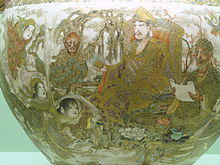 The first major presentation of Japanese arts and culture to the West was at Paris' Exposition Universelle in 1867, and Satsuma ware figured prominently among the items displayed.[17] The region's governor, the daimyō, understood early the economic, prestige and political advantages of a trade relationship with the West.[18] In order to maintain its connection with Satsuma, for example, Britain offered support to the Daimyō in the 1868 rebellion against the shogunate.[19] The Paris Exposition showcased Satsuma's ceramics, lacquerware, wood, tea ceremony implements, bamboo wicker and textiles under Satsuma's regional banner—rather than Japan's—as a sign of the Daimyō's antipathy to the national shogunate.[20]