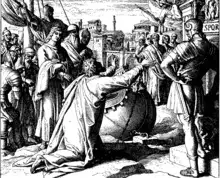 Marcus Antonius Felix then ordered the centurion to keep Paul in custody, but to "let him have some liberty and not to prevent any of his friends from taking care of his needs."[Acts 24:23] He was held there for two years by Felix, until a new governor, Porcius Festus, was appointed. The "chief priests and the leaders of the Jews" requested that Festus return Paul to Jerusalem. After Festus had stayed in Jerusalem "not more than eight or ten days, he went down to Caesarea; the next day he took his seat on the tribunal and ordered Paul to be brought." When Festus suggested that he be sent back to Jerusalem for further trial, Paul exercised his right as a Roman citizen to "appeal unto Caesar".[27] Finally, Paul and his companions sailed for Rome where Paul was to stand trial for his alleged crimes.[92]