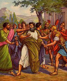 When the seven days of the purification ritual were almost completed, some "Jews from Asia" (most likely from Roman Asia) accused Paul of defiling the temple by bringing gentiles into it. He was seized and dragged out of the temple by an angry mob. When the tribune heard of the uproar he and some centurions and soldiers rushed to the area but were unable to determine his identity and the cause of the uproar, so they placed him in chains.[Acts 21:27–36] He was about to be taken into the barracks when he asked to speak to the people. He was given permission by the Romans and proceeded to tell his story. After a while the crowd responded, "Up to this point they listened to him, but then they shouted, 'Away with such a fellow from the earth! For he should not be allowed to live.'"[Acts 22:22] The tribune ordered that he be brought into the barracks and questioned by flogging. Paul asserted his Roman citizenship, which would prevent his flogging. The tribune "wanted to find out what Paul was being accused of by the Jews, the next day he released him and ordered the chief priests and the entire council to meet".[Acts 22:30] Paul spoke before the council and caused a dissention between the Pharisees and Sadducees. When this threatened to turn violent the tribune ordered his soldiers to take Paul by force and return him to the barracks.[Acts 23:10]