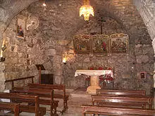 After his conversion, Paul went to Damascus, where Acts 9 states he was healed of his blindness and baptized by Ananias of Damascus.[55] Paul says that it was in Damascus that he barely escaped death.[2 Cor. 11:32] Paul also says that he then went first to Arabia, and then came back to Damascus.[Gal. 1:17][56] Paul's trip to Arabia is not mentioned anywhere else in the Bible, and some suppose he actually traveled to Mount Sinai for meditations in the desert.[57][58] He describes in Galatians how three years after his conversion he went to Jerusalem. There he met James and stayed with Simon Peter for 15 days.[Gal. 1:13–24] Paul located Mount Sinai in Arabia in Galatians 4:24–25.