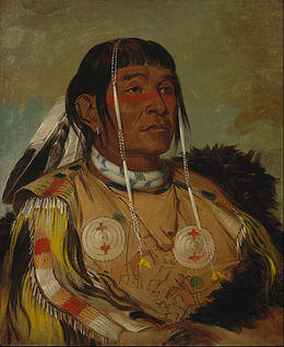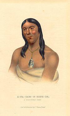 A-na-cam-e-gish-ca (Aanakamigishkaang / "[Traces of] Foot Prints [upon the Ground]"), Rainy Lake Ojibwe chief, painted by Charles Bird King during the 1826 Treaty of Fond du Lac & published in History of the Indian Tribes of North America.- Couchiching First Nation, Fort Frances, ON (population 1,989)
