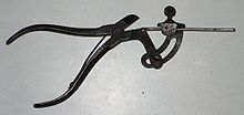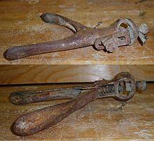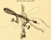 The inventor Charles Morrill introduced a saw set with a plunger based on his patent.[5] This design, as well as improvements added to it, came into prolific use and in the United States are frequently found with woodworking tools. An image of a Morrill design saw set is found at the introduction of the article. The plunger (also, pin) pushes against the saw tooth when the handles are squeezed together. The other face of the saw tooth rests against an anvil and the whole saw blade is held at the desired angle to the anvil by a stop or rest. On most designs both the anvil and the rest are adjustable.