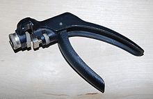 Two-handled, or pistol-grip saw sets use the action of two handles closing to move cams or plungers. A pistol-grip style tool is most often what is thought of as a saw set in contemporary discussions of saw maintenance, especially amongst hand tool enthusiasts.[3]