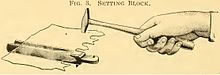 Another form uses either a bevel-edged anvil or setting block so that the saw blade rests on a flat portion of the anvil and the tooth held over the bevel, to be struck until bent to the desired angle. Its use is described by the following: