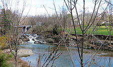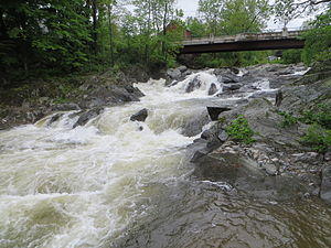 There are three notable waterfalls on the Saxtons River, listed from upriver to downriver: Saxtons River Falls in the village of Saxtons River, just below Centennial Bridge on Westminster St; Gages Falls in North Westminster, also called Gageville, just below the bridge on Covered Bridge Rd; and Twin Falls, a short distance downriver from Gages falls in North Westminster near Forest Rd.[5][6]