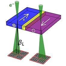 where is the wavelength of the electron, the Planck constant and is integrated magnetic induction along the trajectory of the electron. This last term reduces to when the electron beam is perpendicular to a sample of thickness with constant in-plane magnetic induction of magnitude . The beam deflection can then be imaged on a segmented or pixelated detector.[26] This can be used to image magnetic[26][27] and electric fields[28] in materials. While the beam deflection mechanism through the Lorentz force is the most intuitive way of understanding DPC, a quantum mechanical approach is necessary to understand the phase-shift generated by the electromagnetic fields through the Aharonov–Bohm effect.[26]