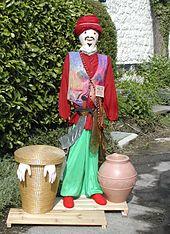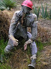 A scarecrow is a decoy or mannequin, often in the shape of a human. Humanoid scarecrows are usually dressed in old clothes and placed in open fields to discourage birds from disturbing and feeding on recently cast seed and growing crops.[1] Scarecrows are used across the world by farmers, and are a notable symbol of farms and the countryside in popular culture.