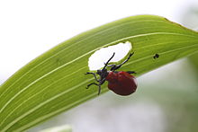 The scarlet lily beetle, red lily beetle, or lily leaf beetle (Lilioceris lilii), is a leaf beetle that eats the leaves, stem, buds, and flowers, of lilies, fritillaries and other members of the family Liliaceae. It lays its eggs most often on Lilium and Fritillaria species. In the absence of Lilium and Fritillaria species, there are fewer eggs laid and the survival rate of eggs and larvae is reduced.[1] It is now a pest in most temperate climates where lilies are cultivated.