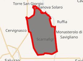 Scarnafigi borders the following municipalities: Lagnasco, Monasterolo di Savigliano, Ruffia, Saluzzo, Savigliano, Torre San Giorgio, and Villanova Solaro.