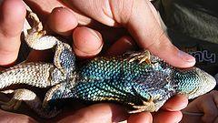 An adult male desert spiny lizard usually have conspicuous blue/violet patches on the belly and throat, and a green/blue color on their tails and sides (“Lizards “28. Science Reference Center). Females and juveniles have large combined dark spots on their back and belly areas, and the blue/violet and green/blue coloring is absent. Both sexes have brownish/yellow triangular spots on their shoulders. A female Desert Spiny Lizard will lay anywhere from 4 to 24 eggs during the summertime (“Lizards “28. Science Reference Center). A fully grown desert spiny lizard will reach a body length of up to 5.6 inches. Besides their bright colors, the desert spiny lizard changes to darker colors during the winter to allow them to absorb more heat from the sun, and become lighter during the summer to reflect the sun's radiation. It is frequently seen doing push-ups, pushing its body up and down, as a form of territorial display.