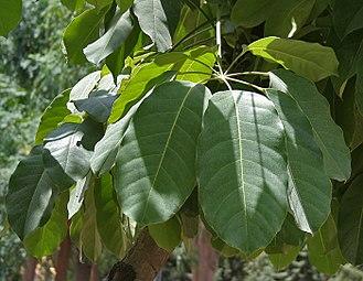 The specific epithet actinophylla means "with radiating leaves".[3]