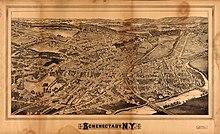 Schenectady (/skəˈnɛktədi/[3][4]) is a city in Schenectady County, New York, United States, of which it is the county seat. As of the 2010 census, the city had a population of 66,135. The name "Schenectady" is derived from the Mohawk word skahnéhtati, meaning "beyond the pines".[5][6] Schenectady was founded on the south side of the Mohawk River by Dutch colonists in the 17th century, many of whom were from the Albany area. The Dutch transferred the name "Skahnéhtati" which is in reality the Mohawk name for Albany, New York. These Dutch were prohibited from the fur trade by the Albany monopoly, which kept its control after the English takeover in 1664. Residents of the new village developed farms on strip plots along the river.