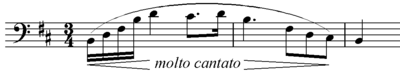 One aspect of strict, two-voice writing that appears to span Schenker’s theory throughout the years of its elaboration is the rule of "fluent melody" (fließender Gesang), or "melodic fluency".[18] Schenker attributes the rule to Luigi Cherubini, who would have written that "fluent melody is always preferable in strict counterpoint."[19] Melodic fluency, the preference for conjunct (stepwise) motion, is one of the main rules of voice leading, even in free composition. It avoids successive leaps and produces "a kind of wave-like melodic line which as a whole represents an animated entity, and which, with its ascending and descending curves, appears balanced in all its individual component parts".[20] This idea is at the origin of that of linear progression (Zug) and, more specifically, of that of the Fundamental Line (Urlinie).