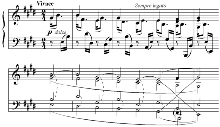 Voice exchange is a common device in counterpoint theory. Schenkerians view it as a means of elaborating a chord by modifying its position. Two voices exchange their notes, often with passing notes in between. At the end of the example of Beethoven’s Op. 109 above, the bass and soprano exchange their notes: G♯ is transferred from bass to soprano, while E is transferred from soprano to bass. The exchange is marked by crossed lines between these notes.[51]