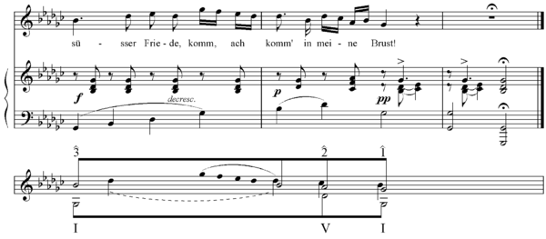 Unfolding (Ausfaltung) is an elaboration by which several voices of a chord or of a succession of chords are combined in one single line "in such a manner that a tone of the upper voice is connected to a tone of the inner voice and then moves back, or the reverse".[47] At the end of Schubert’s Wanderers Nachtlied op. 4 no. 3, the vocal melody unfolds two voices of the succession I–V–I; the lower voice, B♭–A♭–G♭, is the main one, expressing the tonality of G♭ major; the upper voice, D♭–C♭–B♭, is doubled one octave lower in the right hand of the accompaniment: