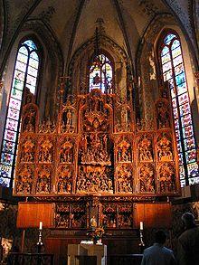 The oak wood altar, carved by Hans Brüggemann from 1514 to 1521, is 12.60 meters high and depicts biblical history from Christ's arrest to Ascension (modelled after Albrecht Dürer's "Little Passion"). In the central piece, Jesus carrying the cross and the descent to hell are emphasized through larger carvings. Ascension and Pentecost are depicted on the altar wings. Next to the central piece, Adam and Eve can be seen. Above everything, Jesus Christ hovers as pantocrator.